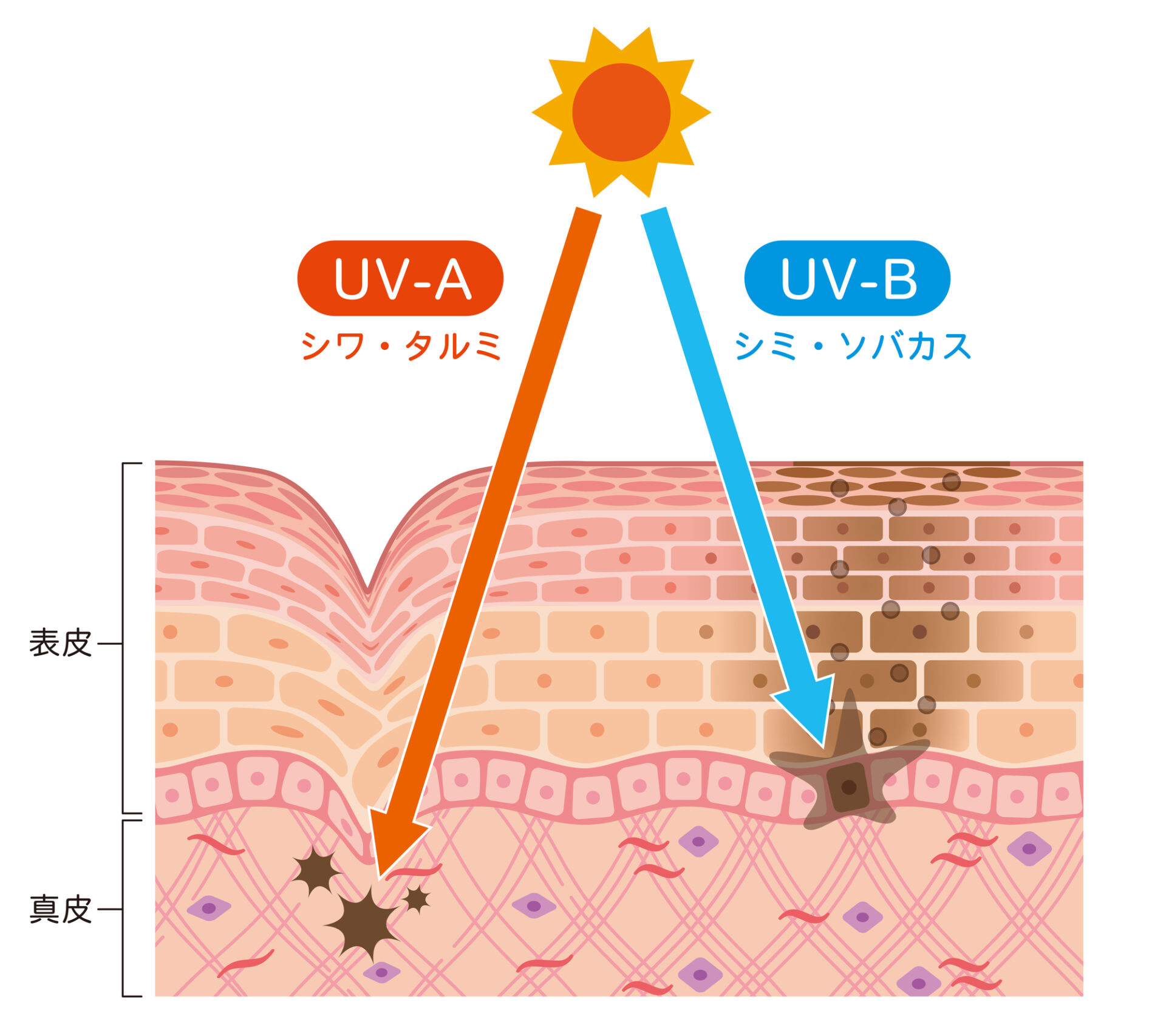 紫外線とは太陽から地球に届く光の一部で、強いエネルギーで物質に化学変化をもたらすのが特徴です。地球に到達する紫外線はA波(UV-A)とB波(UV-B)の2種類あります。A波は肌の深い部分まで届いてコラーゲンを損傷させて肌の弾力を失い、シワやたるみの原因となります。B波は細胞を傷つけて炎症を起こすため、肌を守るために大量にメラニンが生成され肌を黒くします。日焼けやシミの原因となるのはB波の影響ですが、どちらの紫外線も肌にダメージを与えるため対策する必要があるのです。