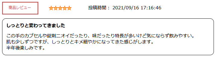 この手のカプセルや錠剤ニオイだったり、味だったり特長が多いけど気にならず飲みやすい。肌も少しずつですが、しっとりとキメ細やかになってきた感じがします。半年後楽しみです。