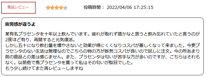 また、プラセンタは匂いが苦手な方が多いのですが、こちらはそれもなく。以前他で馬プラセンタを買って私はその匂いが駄目でした。もう少し続けてまた再レビューしますね