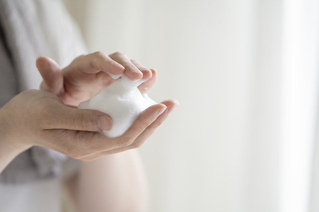 クレンジングや洗顔のときに、肌をゴシゴシこするのは避けたいところです。摩擦は肌への刺激になり、くすみにつながることがあります。クレンジングは手のひら全体でやさしくすべらせるようになじませ、洗顔料はしっかり泡立ててから、顔全体を泡で包み込むように洗いましょう。