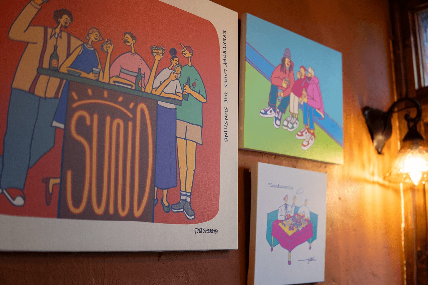 壁にはアートが飾られ、階段の壁にもステッカーが並ぶなど、細部にまでこだわりが光るおしゃれな空間です。