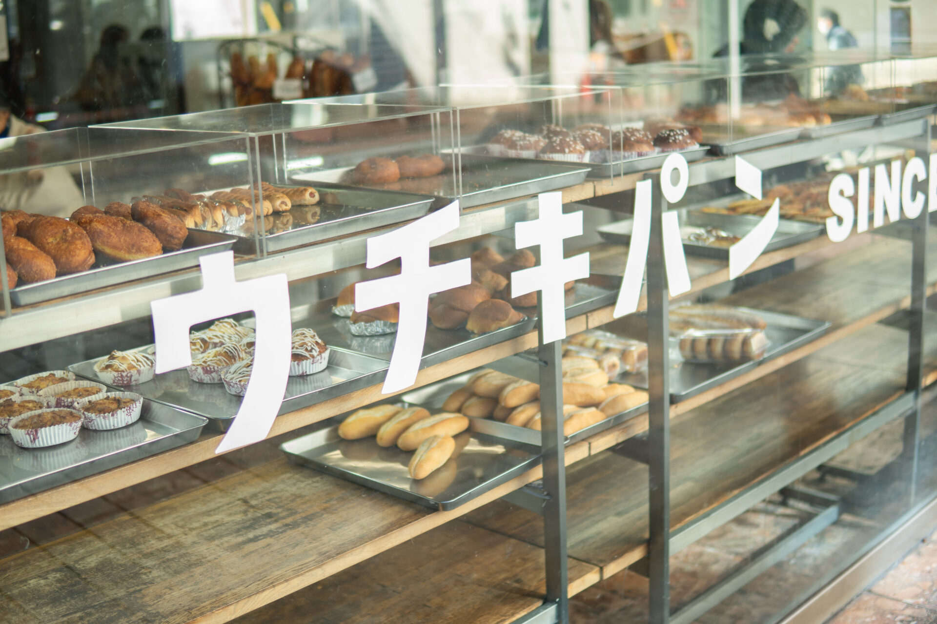 大きなショーケース越しに並ぶパンたち。