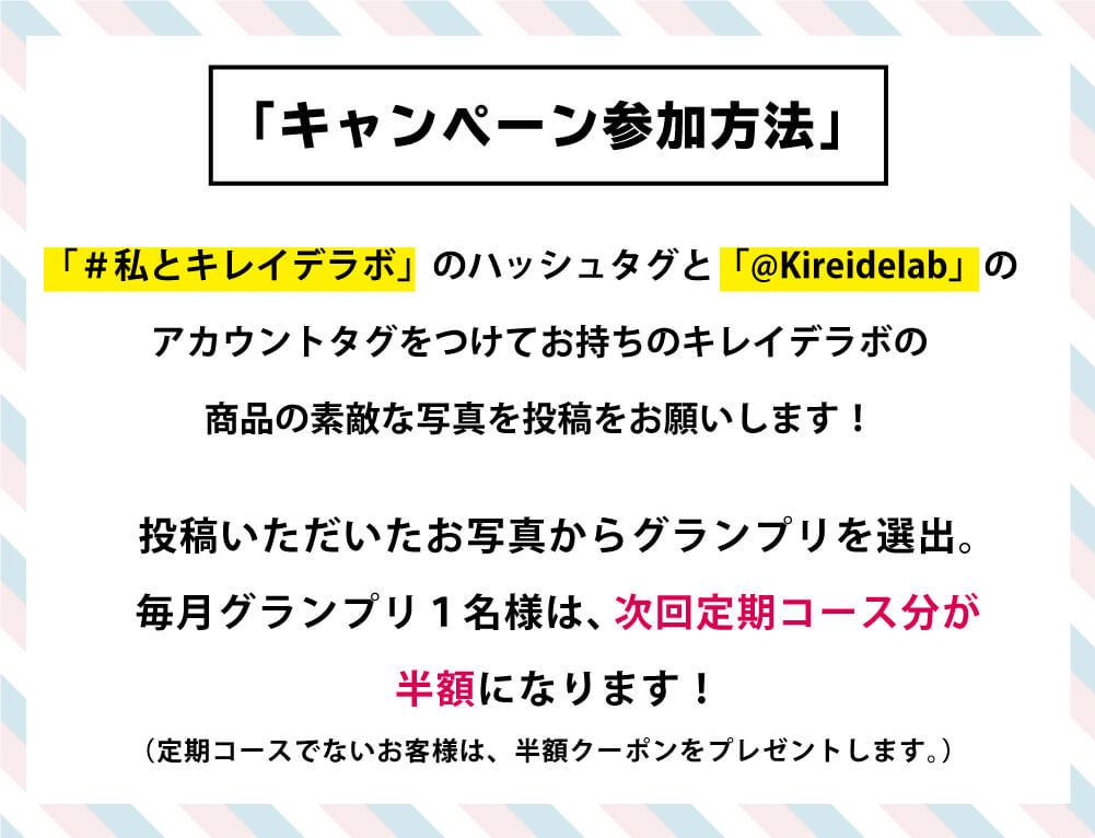 - ●投稿の際は、「#私とキレイデラボ」のハッシュタグと「@kireidelab」のアカウントタグを必ずお付けください。