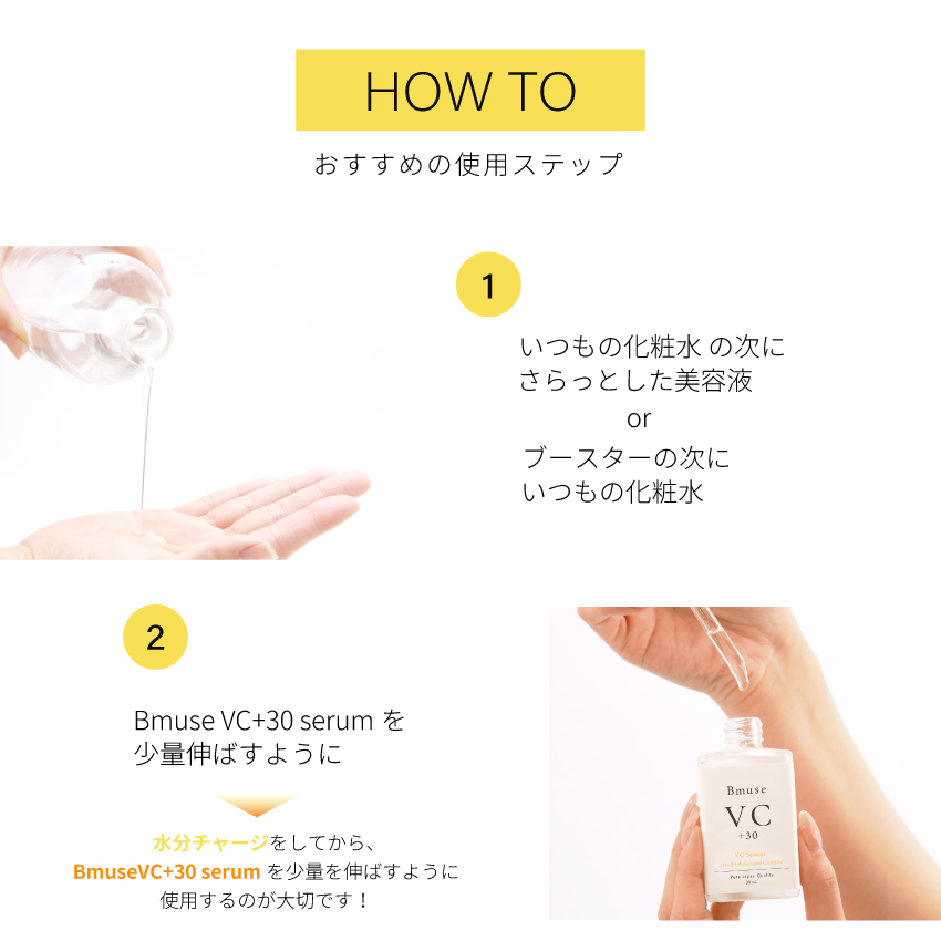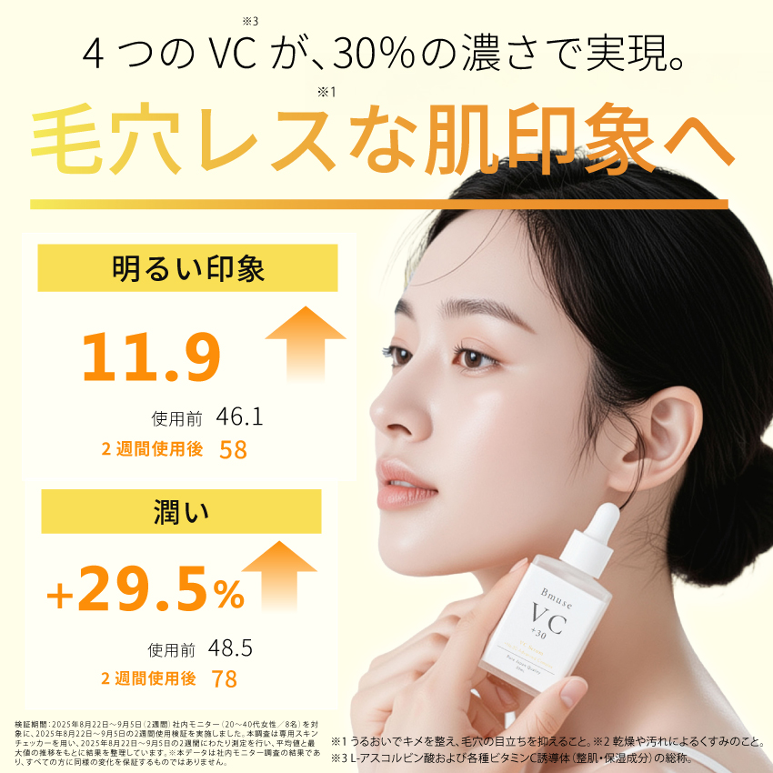 Bmuse VC+30 serumは、顔全体に使える高濃度ビタミンC美容液※1。 ビタミンC(整肌成分)と保湿成分※10を組み合わせることで、 毛穴の目立ち※2やくすみ感※3など、 年齢とともに気になりやすい肌悩みに毎日のスキンケアでアプローチ※5し、 なめらかで明るい肌印象※6を目指します。