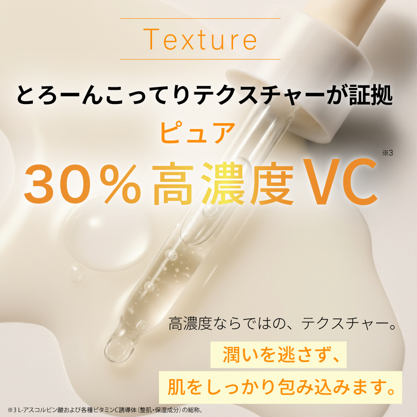 30%の高濃度設計※1ながら、こってりとした濃密テクスチャーで肌にぴたっと密着※15。 乾燥しやすい季節のビタミンCケア※4や、 集中ケア美容液※19として取り入れたい方にもおすすめです。