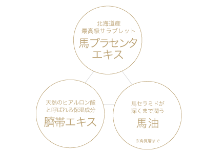 北海道産最高級サラブレッド「馬プラセンタエキス」、天然のヒラルロン酸と言われる保湿成分「臍帯エキス」。