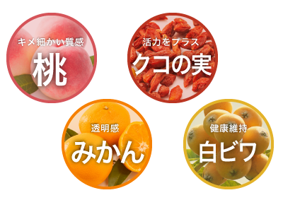 分解コラーゲン、ヒアルロン酸Na、ユズ果実エキス、ビワ葉エキス、クコ果実エキス、アロエベラ葉エキス、クロクスクリサンツス根エキス、乳酸桿菌/ハマナス果実発酵エキス液、アマ